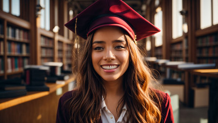 Girl student in a bachelor's cap, happy, smiling, against the background of the university library