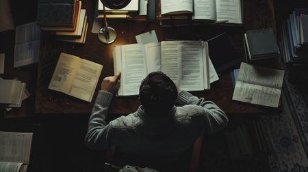 Young man sitting at a desk in a university library, surrounded by stacks of books, taking notes while lost in thought, reflecting on his studies and the pursuit of knowledge