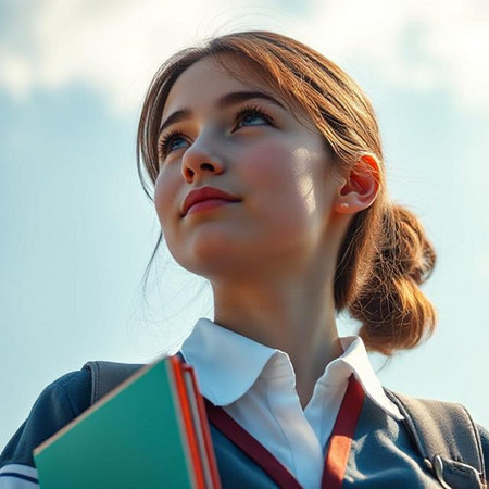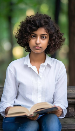 A proud teenage girl with acne scars holds a stack of books in a school library. Soft indoor lighting highlights her confident expression, with blurred bookshelves in the background.