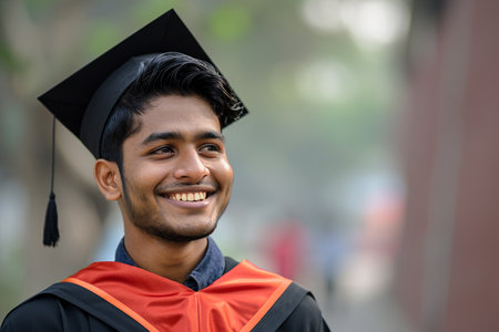 education, graduation and people concept - happy Indian Male graduate student in mortarboard and bachelor gown