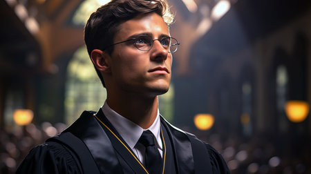 proud graduate gay man wearing academic gown and cap, adorned with a rainbow scarf, representing academic achievement and LGBTQ pride, smiling confidently. High quality photo