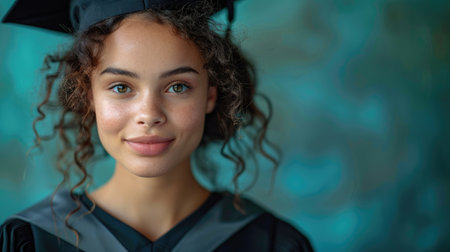 A radiant young graduate with curly hair smiles warmly, her eyes filled with the promise of a bright future.