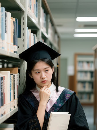 Portrait of young asian woman wearing graduation cap and gown looking at camera