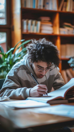 A young man is sitting at a desk with a book open in front of him. He is writing in a notebook with a pencil. The scene suggests that he is studying or working on a project