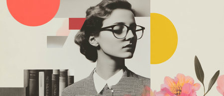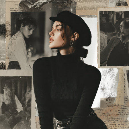 A vintage fashion collage with stylish woman wearing black beret and turtleneck, surrounded by retro black and white photos, evoking nostalgic