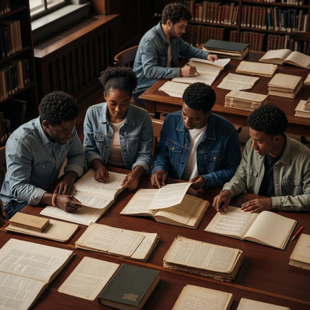 High angle top-down photograph of a diverse group of college students collaborating on archival rese