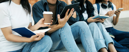 Cropped image, Group of college students preparing for the exam, doing homework or school project together at a campus park.
