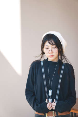 Woman with glasses, casual attire, backpack, stands before a green wall, confident expression, relaxed posture, urban exploration style, everyday travel vibe, approachable and ready