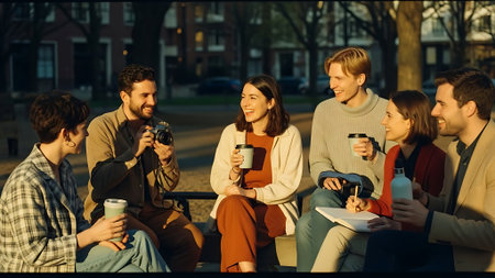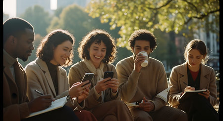 Five young adults sitting outdoors in a park, using smartphones and drinking coffee on a sunny day.