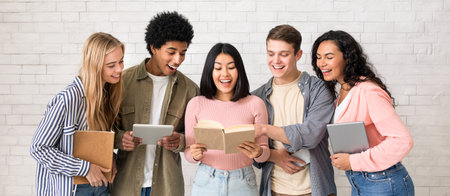 Cheerful interracial students with backpacks and notebooks looking at camera in park, banner