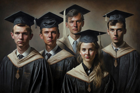 A striking silhouette of five graduates wearing caps and gowns stands together against a breathtaking sunset, symbolizing achievement and new beginnings.