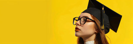 International Student's Day, world, portrait of a beautiful European female student in an academic cap and glasses, brunette, horizontal banner, yellow background