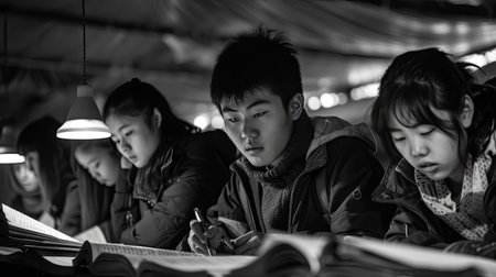 A student's desk brims with organized chaos, filled with scattered books and notes. Despite the clutter, a sense of order prevails, reflecting a busy, dedicated study space