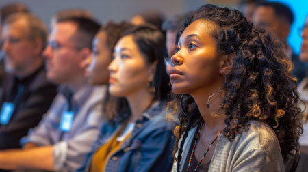 A diverse group of college students engaged in a lecture in a university classroom. Concept Education, College Life, Classroom Environment, Diversity, Student Engagement