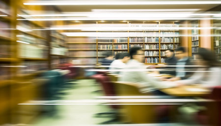 Defocused background image of a busy library with students tered across tables and desks absorbed in their books and research materials. The shelves of books in the background add