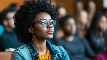 A young woman with glasses and an afro hairstyle shows deep thought during a public event. She embodies engagement and curiosity in a diverse audience.