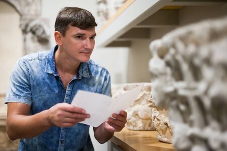 Young man with information booklet in his hands looking at exhibits in historical museum