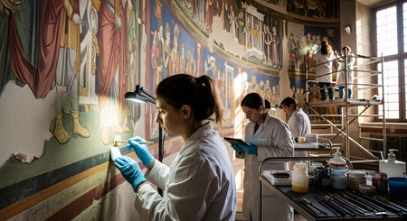 A team of art restorers in white lab coats meticulously work on preserving a large, ancient fresco on a church wall. They use specialized tools, brushes, and lights to carefully clean and restore the historic painting.
