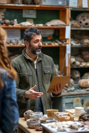A man with a beard is giving a presentation about a collection of artifacts He is standing in a room with shelves full of objects and a table with more items on it The man is looking at the audience, and he is holding a clipboard in his hand AI Generative
