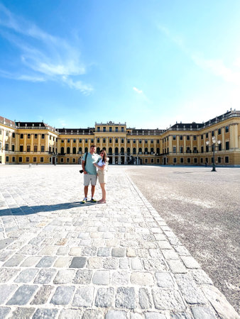 A couple poses in front of a grand European palace, surrounded by a wide, sunlit courtyard in Schonbrunn, Austria.. The clear blue sky enhances the historical and romantic setting.