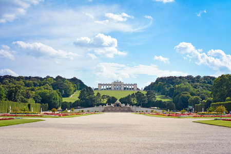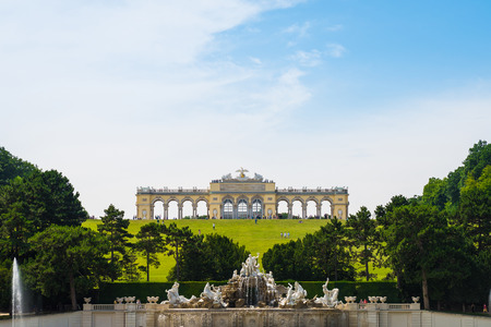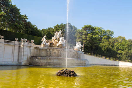 VIENNA, AUSTRIA - SEPTEMBER 11, 2016 : View of historical fountain in Schönbrunn Palace Garden in Vienna, on bright sky background.