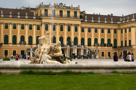 Vienna, Austria - May 1, 2015: Tourists are visiting the Neptune Fountain in the former imperial summer residence known as Schonbrunn Palace.