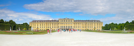 Vienna, Austria - August 28, 2022: Some people walking by the square that leads to the entrance to the Schonbrunn Palace in Vienna, Austria, in a panoramic format