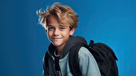 Cute american teenager boy in blue shirt with school bag and books over blue isolated background, half body, as school, education concept