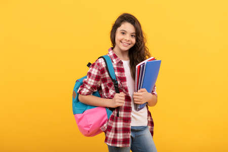 Happy school child hold study books on September 1 yellow background, back to school