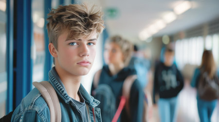 Teenage Boy with Backpack in School Corridor Looking at Camera, Blurred Students in Background