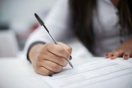 Latin woman hands writing and signing a document or a questionnaire in South America