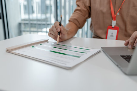 Close-up of unrecognizable manager sitting at desk with tea mug and laptop and filling application form received by mail