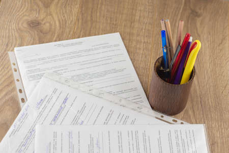 workplace of the businessman: some forms of contracts, filled and empty, and stationery in the pencil case right on the table, the space on top