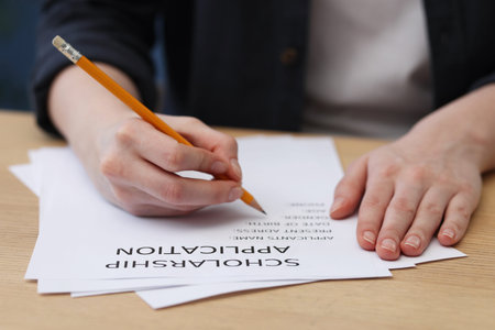 Student filling scholarship application form at wooden table, closeup