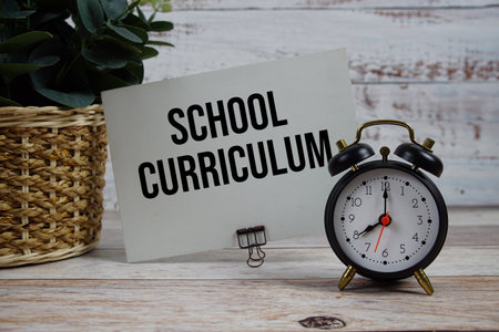 School Curriculum text with alarm clock on wooden background