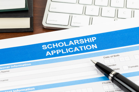 Scholarship application form with pen, keyboard, and text book