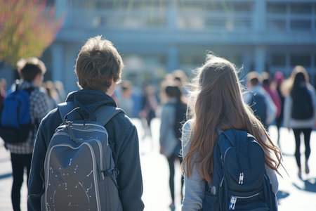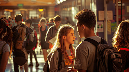 Adolescents stroll along a school's passage, a snapshot of student dynamics and interaction.