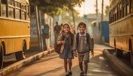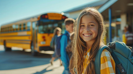 A school bus arriving at the school entrance with happy children getting off Generative AI