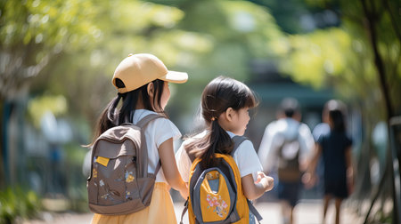 asian children couple going to school, happy kids first day class, smiling to camera with copy space