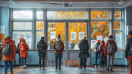 A crowd of students walking down a bustling hallway in a school or university, A bustling hallway filled with students on their way to class
