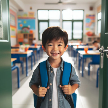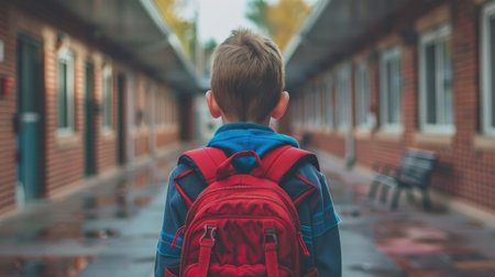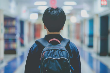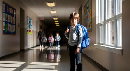 A young boy wearing a blue backpack stands alone in a sunlit school hallway. Other students are blurred in the background, emphasizing themes of education, the first day of school, or student independence.