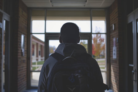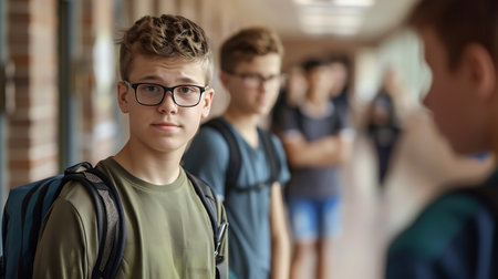 teenager boy stand lonely in a school hallway victim of cyberbullying in school AI generated