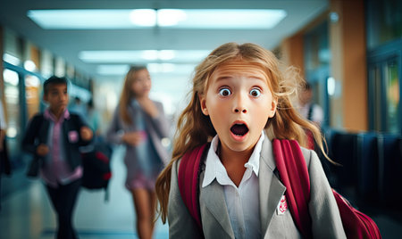 teenager standing alone at school, looking around cautiously, background blurred with classmates