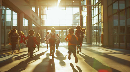 Group of children wearing backpacks running through a sunlit hallway, enjoying the bright morning light at school.