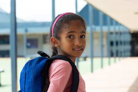Girl child standing in covered school corridor, wearing pink headband and carrying blue backpack. Education, campus, walkway, architecture, columns, modern, sunlit