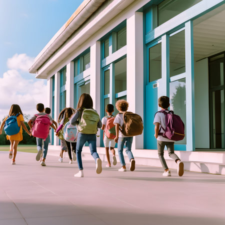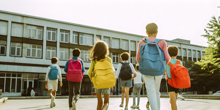 A group of elementary school children, seen from the back, joyfully sprint towards their school at the start of the new term, back to school.