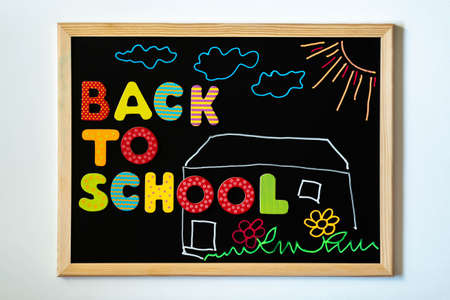 Blackboard with text Back to school of colorful wooden letters and chalk drawing of schoolhouse, grass, flowers, sun, and clouds. Words Back to school and painting on chalkboard. Education concept.