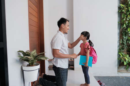 portrait of indonesian primary school female student shake and kiss her fathers hand before going to school
