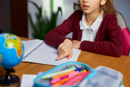girl doing homework at home table solving math assignments, homeschooling by the light of the lamp, child doing lessons in a notebook at the desk in the home room