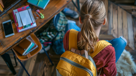 School classroom. New school bag on a students desk in the classroom. Generative Ai.